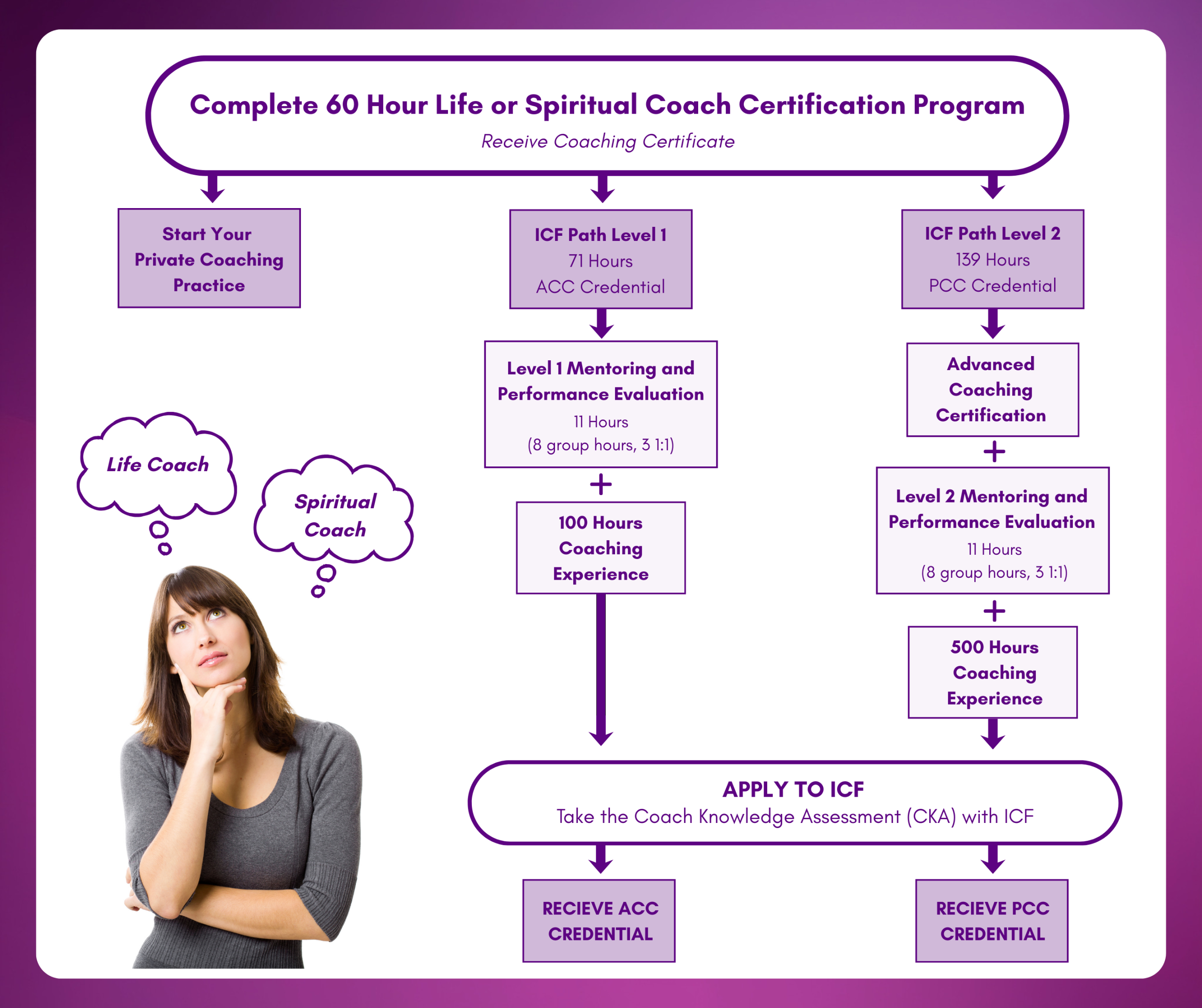 After completing one of Life Purpose Institute’s 60-hour Certification Programs, you’ll earn the designation of Certified Life Coach (CLC) or Certified Spiritual Coach (CSC). This program is your first step toward obtaining an ICF credential.